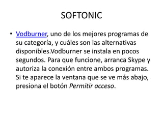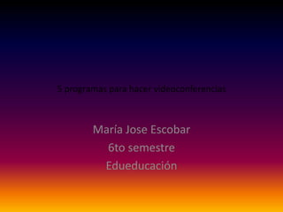 Los documentos describen 5 programas y redes sociales para realizar videoconferencias y comunicación en línea: Vodburner, Hangouts, Camtasia, Messenger y Logitech Vid HD para videoconferencias, e Instagram, Facebook, Twitter para redes sociales. Se explican las características y funcionalidades principales de cada una de estas herramientas.