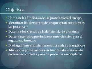 Este documento describe las funciones y requerimientos de las proteínas en el cuerpo humano. Explica que las proteínas están compuestas por aminoácidos y cumplen funciones estructurales, enzimáticas y de transporte en el cuerpo. Señala que los requerimientos diarios recomendados son de 0.8 gramos de proteína por kilo de peso corporal. También identifica fuentes alimenticias de proteínas completas y incompletas de origen animal y vegetal.