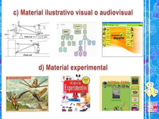 El documento distingue entre recursos y materiales didácticos, señalando que los recursos son cualquier elemento utilizado con una finalidad educativa mientras que los materiales son elementos elaborados específicamente para facilitar el aprendizaje. Además, clasifica los recursos y materiales didácticos y discute la funcionalidad de ambos en el contexto educativo, proporcionando referencias adicionales.