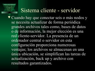 Este documento describe los componentes clave de una red cliente-servidor, incluyendo las ventajas de este modelo cuando se necesita actualizar grandes archivos de forma periódica. También explica los roles del servidor y del administrador de red, así como las diferentes ediciones de Windows Server 2003.