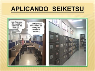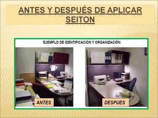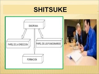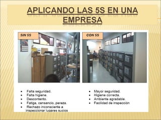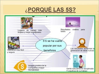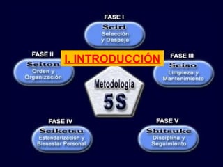 Este documento describe los principios de las 5S, una metodología de organización y limpieza en el lugar de trabajo originada en Japón. Las 5S son Seiri (clasificar), Seiton (ordenar), Seiso (limpiar), Seiketsu (estandarizar) y Shitsuke (autodisciplina). El objetivo es mantener un ambiente de trabajo ordenado, limpio y eficiente mediante la clasificación y organización de elementos, limpieza regular y estandarización de procesos.
