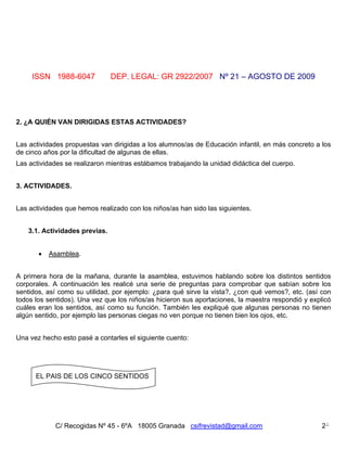Este documento describe una serie de actividades educativas para trabajar los cinco sentidos con niños de educación infantil. Las actividades incluyen juegos, trabajos manuales, poesías y canciones relacionadas con cada uno de los sentidos como la vista, el oído, el gusto, el olfato y el tacto. El objetivo es que los niños aprendan sobre sus sentidos y su importancia a través de experiencias prácticas y lúdicas.