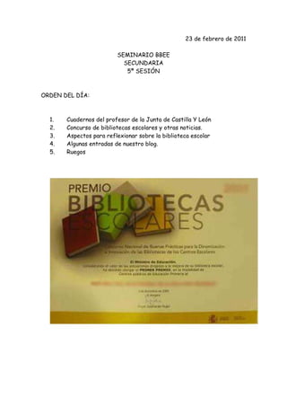 El documento presenta el orden del día de la 5a sesión de un seminario sobre bibliotecas escolares. Se discutirán temas como un concurso de bibliotecas, aspectos para mejorar las bibliotecas escolares y entradas en un blog sobre bibliotecas. Finalmente, se hace un ruego para retomar lecturas en voz alta durante las sesiones que crean una atmósfera especial.