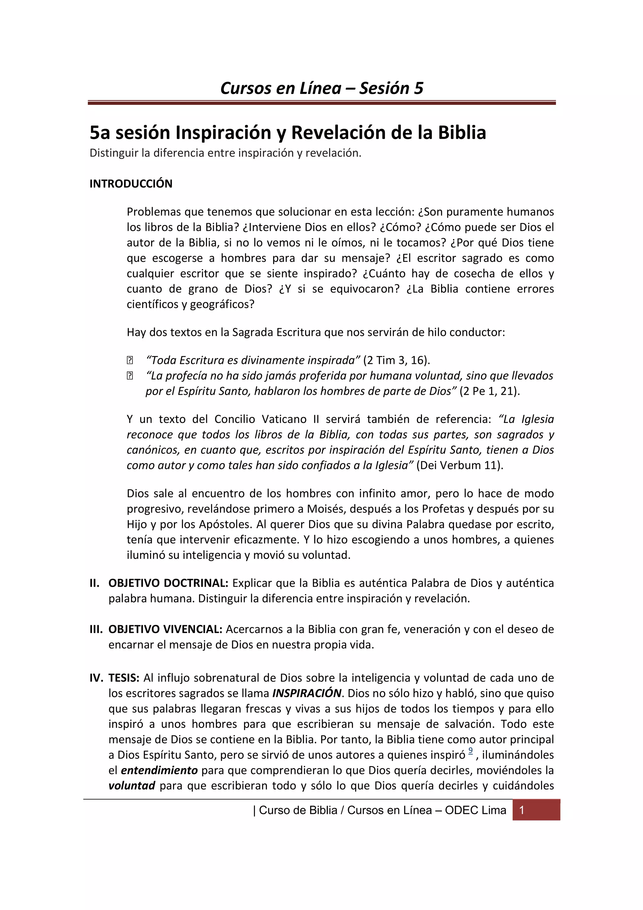 Este documento explica la inspiración y revelación de la Biblia. Define la inspiración como la influencia sobrenatural del Espíritu Santo en los autores humanos de la Biblia para asegurar que escribieran lo que Dios quería revelar sin errores. También distingue entre la inspiración, por la cual Dios es el autor principal de la Biblia a través de los autores humanos, y la revelación, por la cual Dios se manifiesta a los lectores de la Biblia. Finalmente, discute algunas consecuencias de la inspiración como la un