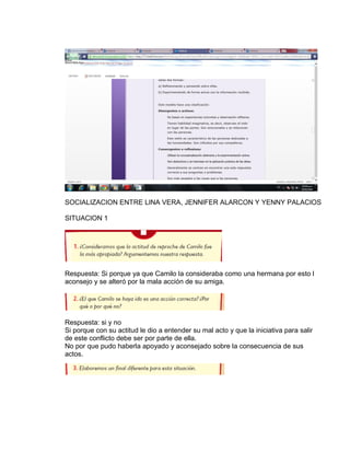 El documento presenta 5 situaciones sociales. En la primera, un amigo se altera al ver a su amiga en mal estado debido a su cariño por ella. En la segunda, se discuten consejos sobre cómo manejar información de otros. La tercera trata sobre donaciones en mal estado. La cuarta contrasta la solidaridad y caridad. La quinta involucra a una persona que engaña a clientes cobrando por trabajos no realizados.