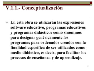 Este documento define el software educativo y describe sus características principales. Define el software educativo como cualquier programa creado específicamente para facilitar los procesos de enseñanza y aprendizaje, incluyendo programas basados en modelos conductistas y programas más avanzados basados en inteligencia artificial. Explica que los programas educativos comparten cinco características: son materiales con una finalidad didáctica, utilizan el ordenador como soporte, son interactivos, individualizan el trabajo del estudiante y son fáciles de usar. Final