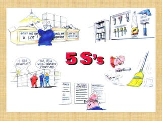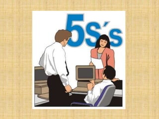 El documento describe los cinco pasos del sistema de orden y limpieza 5S: Seiri (separar lo necesario de lo innecesario), Seiton (ordenar y designar un lugar para cada elemento necesario), Seiso (limpiar el área de trabajo), Seiketsu (establecer sistemas para mantener los primeros tres pasos) y Shitsuke (estandarizar las prácticas de los primeros cuatro pasos y fomentar la autodisciplina). El objetivo final es crear y mantener un entorno de trabajo ordenado, limpio y eficiente.