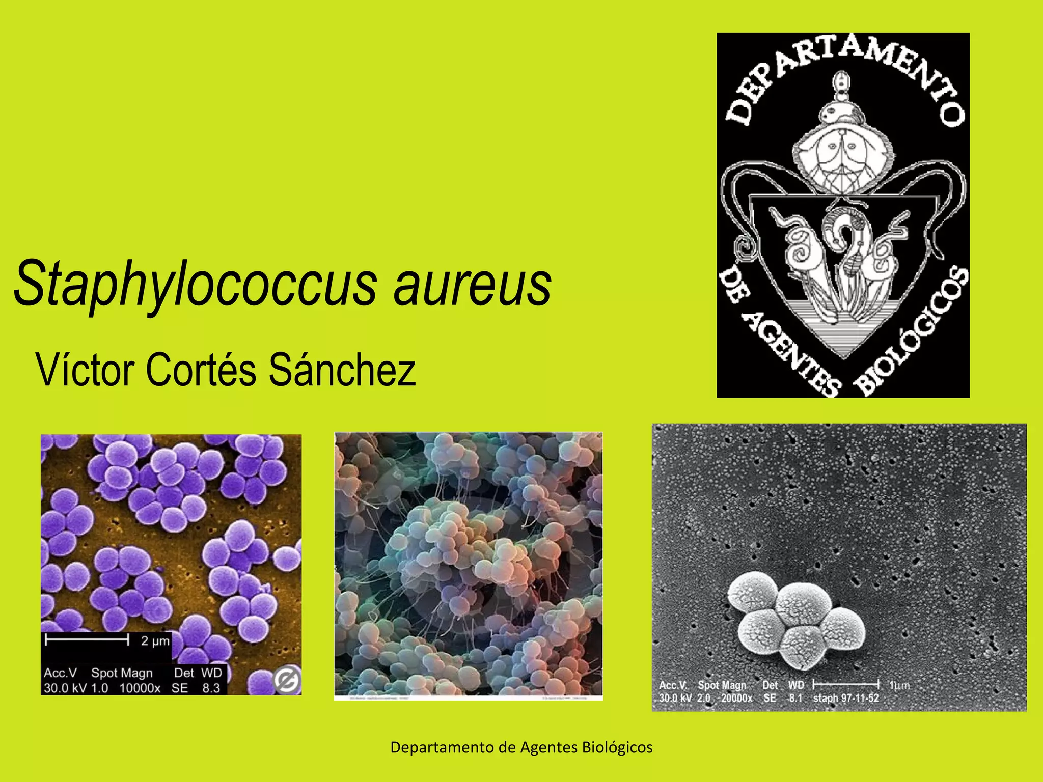 Staphylococcus aureus es un agente bacteriano común que causa una amplia gama de infecciones, desde leves hasta potencialmente mortales. Es un coco grampositivo que se transmite entre personas y coloniza la piel y mucosas. Produce diversas toxinas que causan enfermedades como neumonías, intoxicaciones alimentarias, shock tóxico y otras infecciones. Su diagnóstico se realiza mediante cultivos bacteriológicos e identificación bioquímica, y su tratamiento depende del tipo y gravedad de la infección.