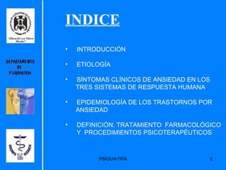 Este documento describe los principales trastornos de ansiedad, incluidos sus síntomas, diagnósticos, tratamientos farmacológicos y psicoterapéuticos. Se calcula que una quinta parte de la población sufrirá algún trastorno de ansiedad a lo largo de su vida. Los trastornos más comunes son el de pánico, la agorafobia, las fobias específicas, la fobia social, el trastorno obsesivo compulsivo, el de ansiedad generalizada y el de estrés postraumático. Aunque