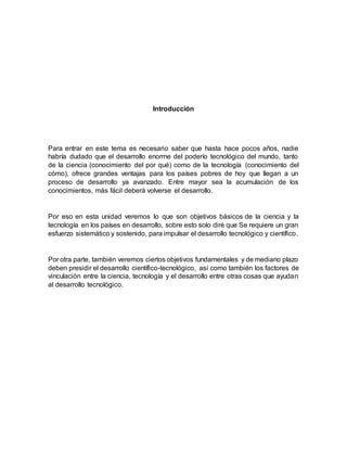 Este documento discute la importancia de la ciencia y la tecnología para el desarrollo de los países en desarrollo. Explica que se requiere un gran esfuerzo sostenido para impulsar el desarrollo científico y tecnológico, con objetivos como satisfacer las necesidades básicas de la población. Identifica cinco factores clave de vinculación entre la ciencia, tecnología y desarrollo: apropiación social del conocimiento, generación de conocimiento a través de la educación, producción, desar