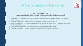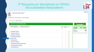 Nerea Márquez Delgado, en su master sobre nuevas tendencias asistenciales en ciencias de la salud, busca información sobre la exploración, diagnóstico y terapia manipulativa en la articulación del tobillo, utilizando la base de datos CINAHL y limitando su búsqueda a publicaciones arbitradas desde 2010. Exporta referencias a Mendeley para crear bibliografía en formato Vancouver y establece alertas semanales para novedades sobre el tema. Finalmente, documenta y publica todo el proceso en su blog.