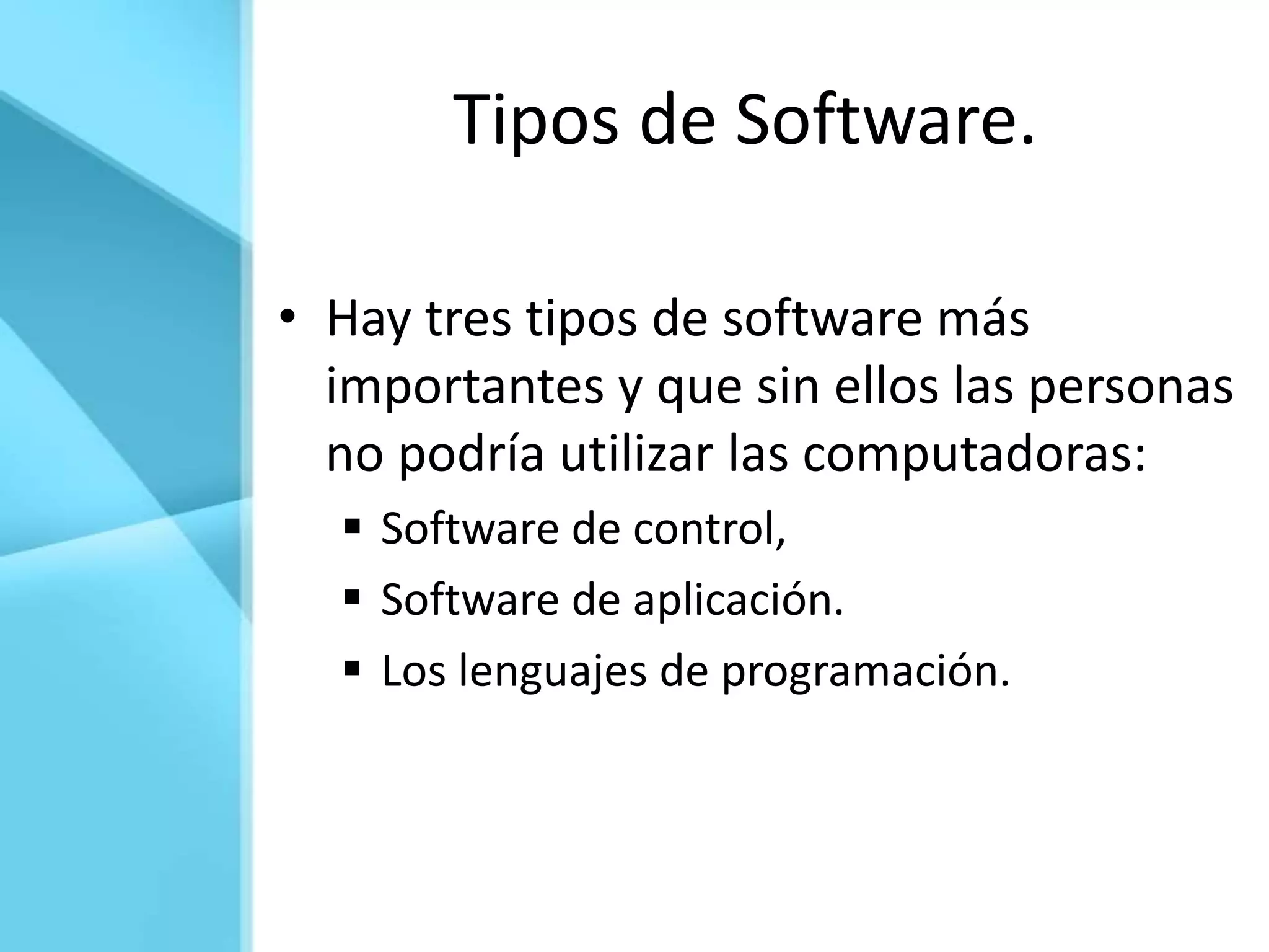 Este documento describe tres tipos principales de software: software de control, software de aplicación y lenguajes de programación. El software de control incluye sistemas operativos, software de diagnóstico y mantenimiento e intérpretes de lenguaje de control. El software de aplicación incluye software específico, de productividad, general e integrado. Los lenguajes de programación permiten expresar algoritmos a la CPU y pueden clasificarse por nivel de abstracción y tipo de traductor.