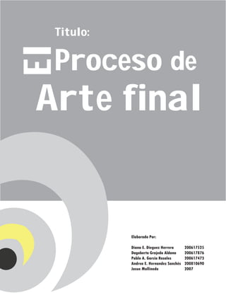 Este documento describe el proceso de arte final para un diseño gráfico. Explica que un arte finalista prepara los diseños para su reproducción mediante la interpretación de ideas y bocetos. Detalla algunos aspectos técnicos que deben considerarse como el formato, resolución, modo de color y sangrado. También discute la importancia de este paso final para entregar un diseño listo para publicación sin errores.