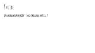 Este documento resume varios conceptos clave sobre cómo fluye la energía y circula la materia en los ecosistemas. Explica que la energía fluye de forma unidireccional a través de las cadenas alimentarias, mientras que la materia circula de forma cíclica a través de los organismos productores, descomponedores y el medio ambiente. También describe los diferentes tipos de interacciones ecológicas como el mutualismo, depredación, competencia y otros, e incluye información sobre los ciclos biogeoquímicos del