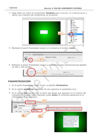 Este documento describe cómo usar el componente TextArea en Flash CS3. Explica cómo insertar un componente TextArea en una escena, asignarle un nombre y dimensiones, y establecer la propiedad wordWrap en true para que el texto se ajuste a la caja. También muestra cómo escribir texto directamente en la propiedad text para que aparezca dentro del componente en la escena.