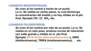 Este documento describe diferentes tipos de ligandos y sus propiedades para la valoración con EDTA. Explica que los ligandos polidentados como el EDTA forman complejos más estables que permiten una titulación en un solo paso con un punto final nítido. También describe diferentes métodos de valoración con EDTA como directa, por retroceso o por desplazamiento, e indicadores metalocrómicos. Finalmente, analiza factores que influyen en las curvas de valoración como el pH, la constante de formación del complejo y la concentración de amoníaco.
