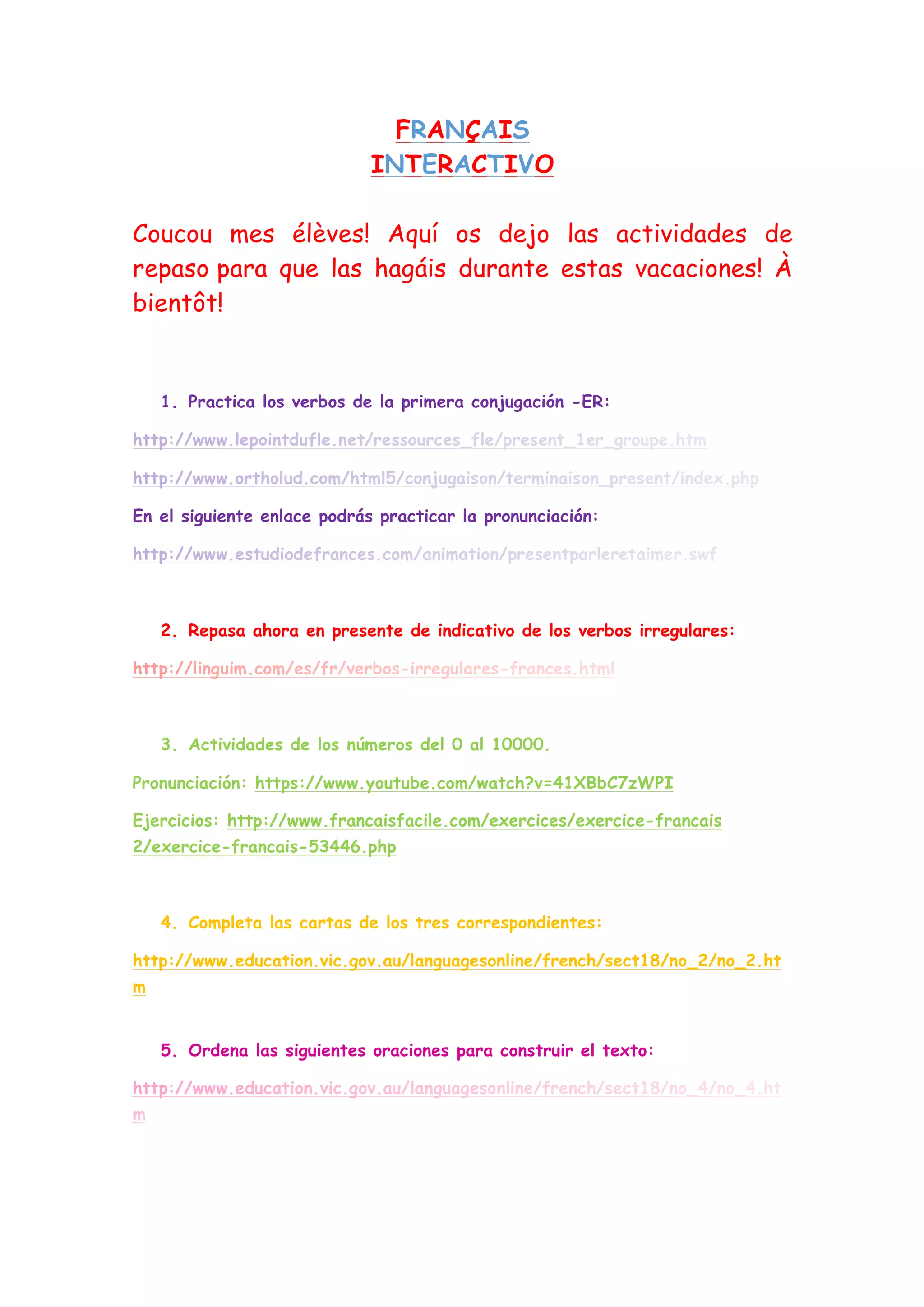 El documento proporciona 5 actividades de repaso en francés para que los estudiantes las completen durante las vacaciones. Incluye práctica de verbos de la primera conjugación, verbos irregulares en presente, números del 0 al 10000, completar cartas, y ordenar oraciones para construir un texto. Se proporcionan enlaces a videos y ejercicios en línea para cada actividad.