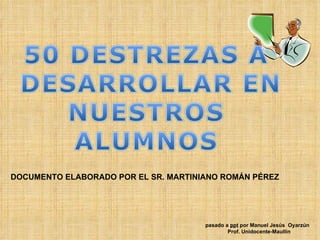 Este documento define 50 destrezas mentales y sus pasos mentales asociados. Cada destreza, como analizar o clasificar, se describe brevemente y se enumeran los pasos mentales necesarios para desarrollarla, como observar los elementos y verificar las relaciones. El objetivo es ayudar a los estudiantes a interiorizar estas habilidades mentales y aplicarlas a diversas situaciones de aprendizaje.