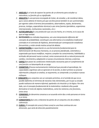 Este documento proporciona definiciones de 50 palabras relacionadas con conceptos estadísticos, matemáticos y de investigación. Cada entrada incluye el término definido y una breve explicación de su significado. El documento tiene como objetivo brindar información concisa sobre una variedad de términos técnicos.