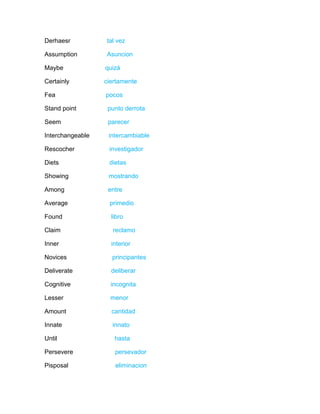 Derhaesr tal vez Assumption Asuncion Maybe quizá Certainly ciertamente Fea pocos Stand point punto derrota Seem parecer Interchangeable intercambiable Rescocher investigador Diets dietas Showing mostrando Among entre Average primedio Found libro Claim reclamo Inner interior Novices principantes Deliverate deliberar Cognitive incognita Lesser menor Amount cantidad Innate innato Until hasta Persevere persevador Pisposal eliminacion