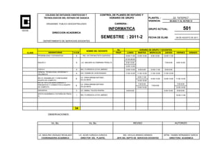 Este documento presenta el horario de clases y los docentes asignados para el grupo 501 de la carrera de Informática en el plantel 22 "Ixtepec" del Colegio de Estudios Científicos y Tecnológicos del Estado de Oaxaca para el semestre 2011-2. Incluye las asignaturas, horas semanales de clase, días y horarios de cada materia impartida por los diferentes docentes. Al final se incluyen las firmas y cargos de quienes autorizaron el plan de estudios y horario de grupo.