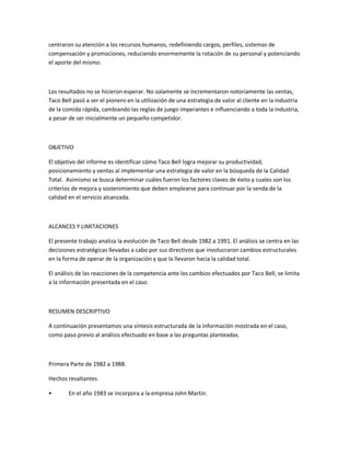 El documento describe la evolución de Taco Bell en la década de 1980 y principios de 1990. Inicialmente, la empresa tenía una visión distorsionada de su negocio y se enfocaba más en la producción de alimentos que en el servicio al cliente. En 1983, John Martin asumió el liderazgo y redireccionó la estrategia hacia satisfacer las necesidades de los clientes. Implementó programas como C-Menos, RES y TACO para mejorar la productividad, calidad y servicio. Estos cambios transformaron con éxito a Taco Bell y sentaron