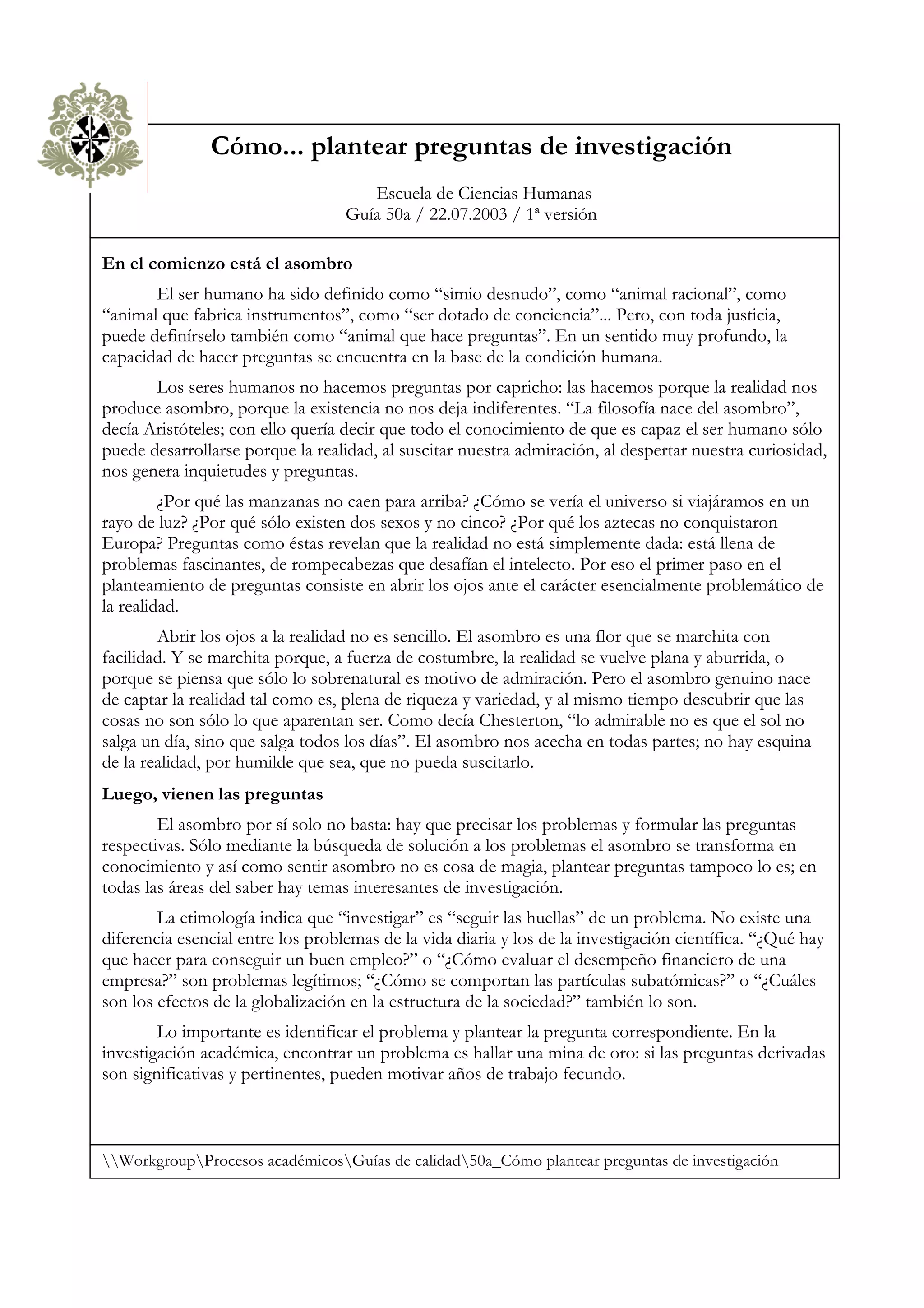 1) El documento explica que la capacidad de hacer preguntas es fundamental para la condición humana y que el asombro ante la realidad es el origen de todo conocimiento.