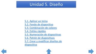 Este documento resume las funciones de diseño en PowerPoint. Explica cómo aplicar temas, configurar fondos de diapositivas, usar estilos rápidos, numerar diapositivas, usar patrones de diapositivas y crear nuevos diseños. El documento proporciona instrucciones paso a paso para utilizar estas herramientas de diseño en PowerPoint.
