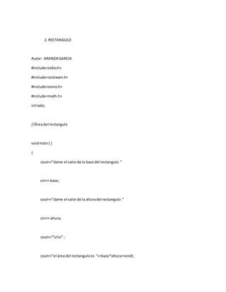 El documento contiene 32 programas en C++ escritos por Aranza Garcia sobre conversiones de unidades de longitud y cálculos de áreas y volúmenes de figuras geométricas. Los programas permiten calcular el área o volumen de figuras como cuadrados, rectángulos, círculos, triángulos, cubos, esferas, al ingresar las medidas requeridas y muestran los resultados. También incluyen conversiones como kilómetros a metros, metros a centímetros, pies y otras unidades.