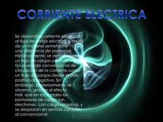 La corriente eléctrica se define como el flujo de carga eléctrica a través de un material sometido a una diferencia de potencial. Históricamente se pensó que era un flujo de cargas positivas, pero se descubrió que en realidad son electrones los que se mueven, con carga negativa. A partir de la corriente eléctrica se definen la intensidad y la densidad de corriente, siendo la intensidad importante para calcular la sección de los elementos conductores de un circuito.