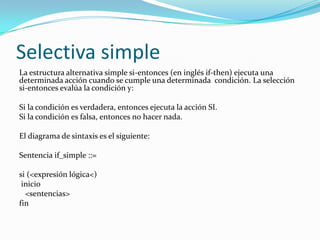 Este documento describe diferentes estructuras selectivas en programación, incluyendo selectivas simples y dobles. Explica la sintaxis y el uso de condicionales if/then y if/then/else para ejecutar acciones condicionalmente dependiendo de si una condición es verdadera o falsa. También presenta tres ejemplos de algoritmos que usan estas estructuras selectivas para resolver problemas como ecuaciones de primer grado, calcular el promedio de números positivos introducidos, y calcular la nómina semanal de empleados dependiendo de sus horas trabajadas