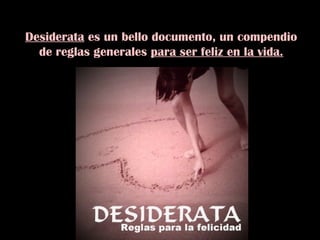Este documento resume las reglas generales para ser feliz en la vida conocidas como "Desiderata". Algunas de las recomendaciones incluyen caminar plácidamente entre el ruido y las prisas, llevarse bien con todas las personas siempre que sea posible, escuchar a los demás incluso a los ignorantes, disfrutar de los logros y los planes, y vivir en paz con el alma a pesar de las dificultades de la vida.