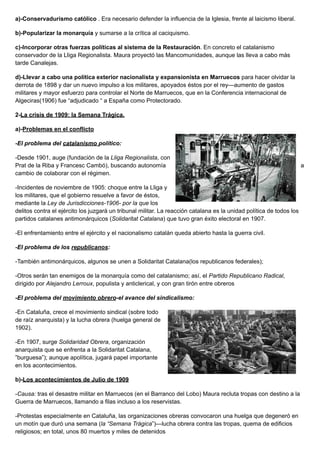El documento resume los principales proyectos y corrientes políticas durante la primera parte del reinado de Alfonso XIII, incluyendo el regeneracionismo, las vertientes conservadora y liberal del reformismo, y el crecimiento del sindicalismo. Surge el regeneracionismo tras el desastre del 98 con vertientes socioeconómica, intelectual y política. El maurismo personifica la renovación conservadora pero la crisis de 1909 debilita al partido. José Canalejas lidera el reformismo liberal con medidas descentralizadoras aunque es asesinado. La oposición republicano