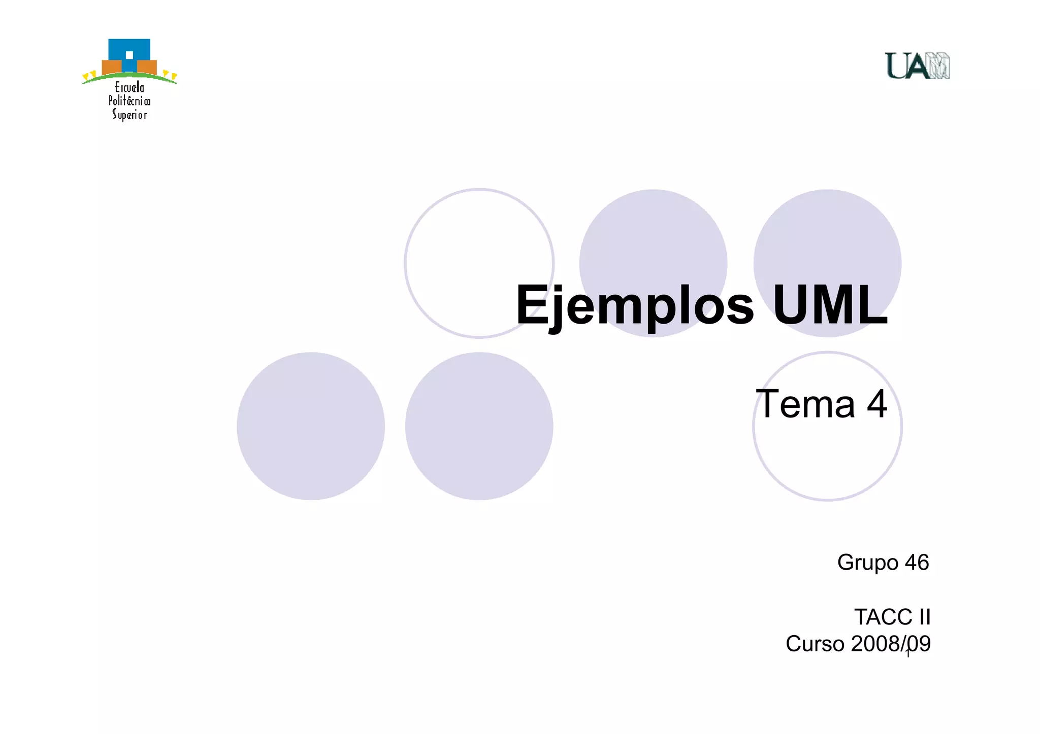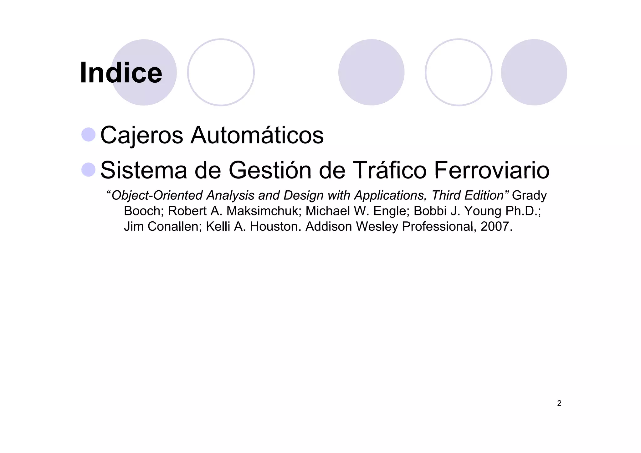 Este documento presenta ejemplos de diagramas UML para el análisis y diseño de dos sistemas: un sistema de cajeros automáticos compartidos por varios bancos y un sistema de gestión de tráfico ferroviario. Incluye casos de uso, diagramas de clases y secuencias detallados para el sistema de cajeros automáticos.