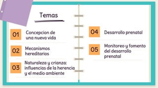 El documento describe las etapas del desarrollo prenatal desde la concepción hasta el nacimiento, incluyendo la formación genética, la influencia de la herencia y el ambiente, y la importancia del monitoreo prenatal. Comienza con la unión del óvulo y el espermatozoide, continúa a través de las etapas germinal, embrionaria y fetal, y concluye resaltando que la atención prenatal oportuna y de calidad es esencial para un desarrollo sano.