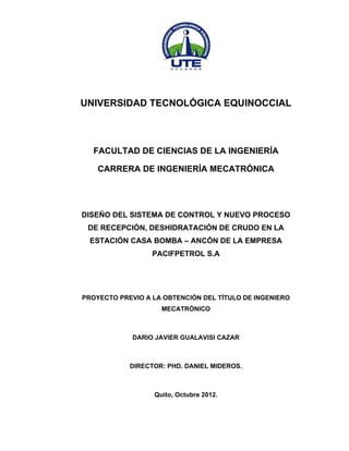 Este documento presenta el diseño de un nuevo sistema de control y proceso de recepción, deshidratación y almacenamiento de crudo en la Estación Casa Bomba de Pacifpetrol S.A. Propone reemplazar el actual sistema por uno que incluye un separador centrífugo, mejorando la calidad del crudo y reduciendo costos de operación y mantenimiento. El diseño mecánico y eléctrico/instrumental del nuevo sistema se detallan en planos, listados, cálculos y parámetros de control.