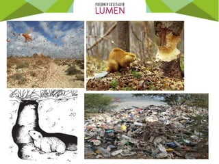 Los organismos interactúan con su ambiente y entre sí en ecosistemas. Un ecosistema incluye la comunidad de organismos que habitan un área física y las relaciones entre ellos y con su entorno. Los cambios en los hábitats afectan a los seres vivos al obligar migraciones o extinciones. El ser humano también impacta los ecosistemas a través de la contaminación y el manejo de recursos. Las poblaciones crecen de forma exponencial o logística dependiendo de los factores limitantes en su entorno.