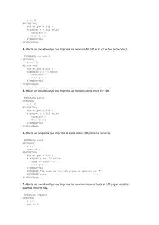 Este documento presenta 52 ejercicios de pseudocódigo divididos en 9 temas, incluyendo bucles y tomas de decisión, bucles anidados y subprogramas, y arrays unidimensionales y multidimensionales. Explica brevemente qué es el pseudocódigo y provee la solución a cada uno de los 52 ejercicios planteados.