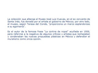Los pintores mexicanos de los años 50 se alejaron de retratar el pasado histórico como lo habían hecho los muralistas antes, y en su lugar buscaron desarrollar estilos individuales que los distinguieran. Algunos de los pintores más prominentes de este movimiento de "ruptura" fueron Rufino Tamayo, José Luis Cuevas, Pedro Coronel, y Gunther Gerzo, entre otros. Juntos revolucionaron el arte en México con sus estilos únicos.