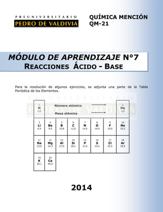 Este documento presenta una tabla periódica de elementos químicos y un módulo de aprendizaje sobre reacciones ácido-base. El módulo incluye ejercicios para identificar especies ácidas, básicas y neutras; completar reacciones; calcular valores de pH y pOH; y resolver problemas de neutralización y titulación ácido-base.