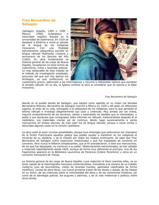 Fray Bernardino de Sahagún nació en España en 1499 y se trasladó a México en 1529 donde pasó el resto de su vida estudiando la lengua y cultura de los indígenas mexicanos. Escribió obras en náhuatl con fines de catequesis cristiana y compiló la Historia General de las Cosas de Nueva España, una extensa obra en 12 tomos sobre las costumbres, mitos y leyendas aztecas basada en entrevistas con ancianos indígenas. Su método pionero de investigación etnogr
