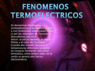 Los tres fenómenos termoeléctricos están relacionados por las relaciones de Thomson. El efecto Seebeck genera una fuerza electromotriz cuando dos metales a diferentes temperaturas se ponen en contacto. Este efecto es la base de funcionamiento de los termopares, que se usan para medir la temperatura en dispositivos domésticos como cocinas y calefactores. El efecto Peltier requiere entregar o extraer calor para mantener constante la temperatura de una unión bimetálica cuando circula una corriente eléctrica a través de