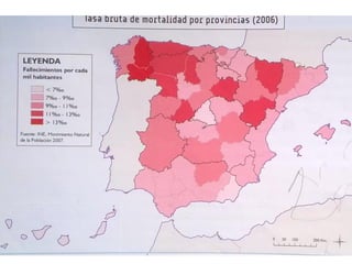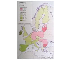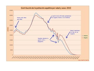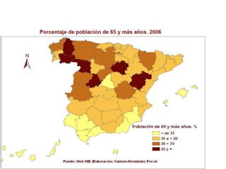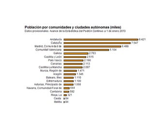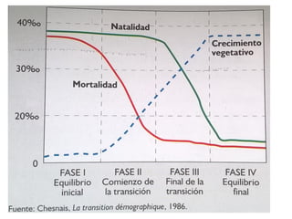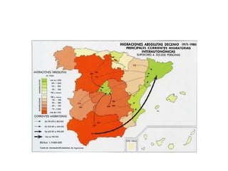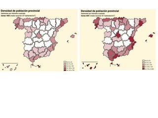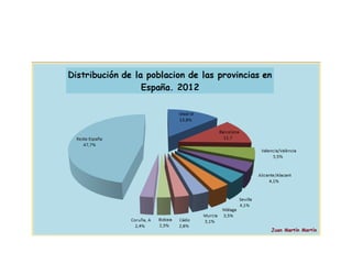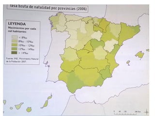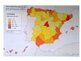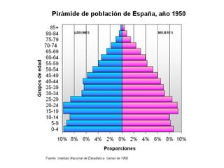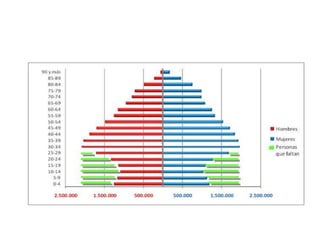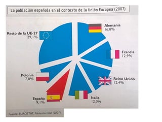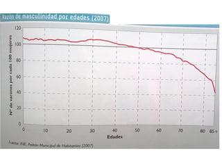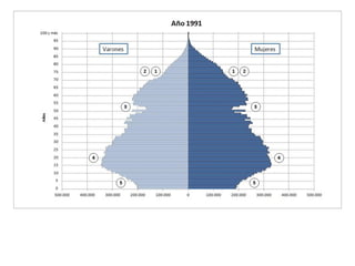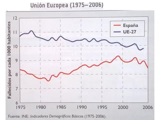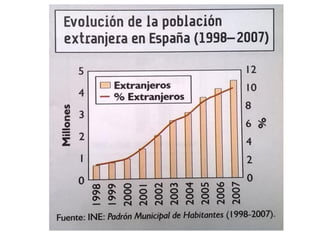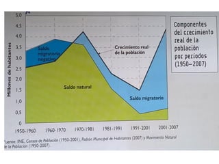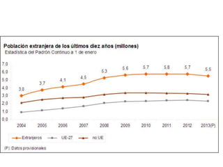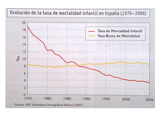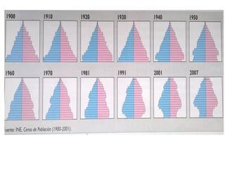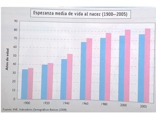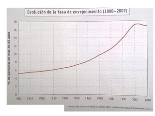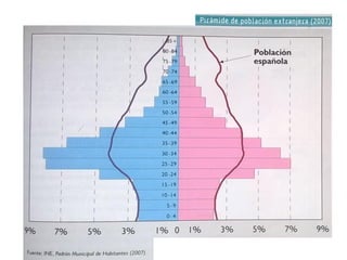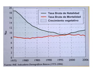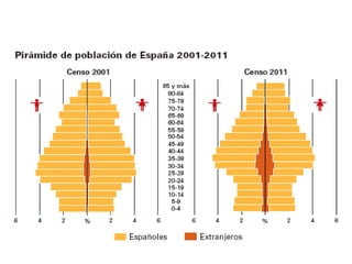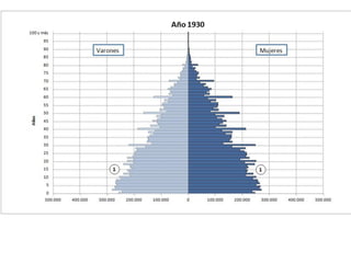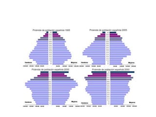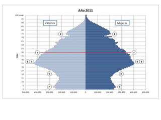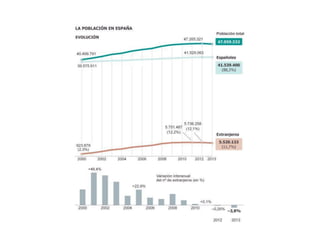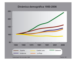 El documento analiza la evolución demográfica de España desde principios del siglo XX hasta 2011, destacando la evolución de la población, tasas de natalidad y mortalidad, y la influencia de la inmigración. Se menciona la transición demográfica, el impacto de la guerra civil, y las proyecciones futuras de la población, que indican un potencial descenso significativo. Además, se abordan las consecuencias sociales y económicas de estos cambios demográficos, incluyendo la integración de inmigrantes y el colapso de la seguridad social.