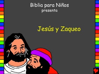 Este resumen narra la historia bíblica de Jesús y Zaqueo. Jesús pasa por la ciudad de Jericó y ve a Zaqueo, un cobrador de impuestos pequeño y odiado, en un árbol. Jesús le llama y va a su casa, lo que enfada a la gente. Zaqueo promete devolver el dinero robado y dar la mitad de sus bienes a los pobres, impresionando a Jesús.