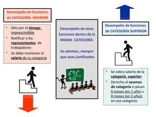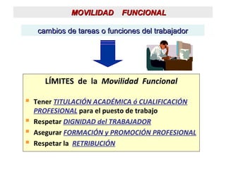 Este documento describe los límites y condiciones de la movilidad funcional de los trabajadores. La movilidad funcional implica cambios de tareas o funciones y debe respetar la titulación, dignidad y formación del trabajador, así como su retribución. Se permite desempeñar funciones de categoría inferior temporalmente y funciones de la misma categoría, mientras que para funciones superiores se cobra el salario superior y hay derecho a ascenso si se cumplen ciertos plazos.