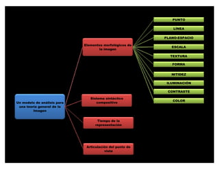 Este documento describe los elementos morfológicos básicos de la imagen como punto, línea, plano, escala, forma, textura, nitidez, iluminación, contraste y color. Explica las funciones plásticas de cada elemento y cómo se pueden combinar para crear significado en una composición visual. También introduce un modelo de análisis compositivo y el concepto de tiempo en la representación.