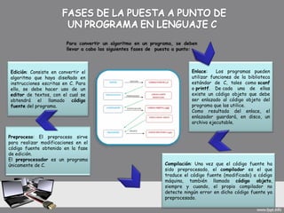 Para convertir un algoritmo en un programa en C, se deben seguir las siguientes etapas: 1) edición para convertir el algoritmo a instrucciones en C, 2) preprocesamiento para realizar modificaciones, 3) compilación para traducir el código a lenguaje máquina, y 4) enlace para crear un archivo ejecutable que incluya funciones de la biblioteca estándar. Un programa en C está compuesto de uno o más funciones e incluye datos, identificadores, constantes, expresiones y operadores.