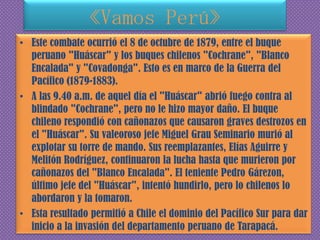 El 8 de octubre de 1879, el buque peruano Huáscar luchó contra tres buques chilenos, el Cochrane, el Blanco Encalada y el Covadonga, en la batalla de Angamos durante la Guerra del Pacífico. A pesar de la valiente defensa del capitán Miguel Grau y sus sucesores, el Huáscar sufrió graves daños y finalmente fue abordado y capturado por los chilenos, dándoles el dominio del Pacífico Sur y permitiéndoles invadir el departamento peruano de Tarapacá.