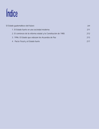 El documento discute la necesidad de un Estado fuerte en Guatemala para resolver los graves déficits sociales. Describe las características de un Estado moderno según la Constitución de 1985, los Acuerdos de Paz de 1996 y el Pacto Fiscal, incluyendo que sea legítimo, tenga el monopolio de la fuerza, aplique la ley de forma pacífica y mantenga autonomía frente a poderes fácticos. También analiza los comienzos de la reforma estatal después de 1985 y cómo los Acuerdos de Paz proponen un Estado dem