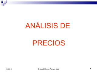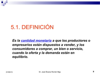 El documento presenta información sobre el análisis de precios. Define el precio de equilibrio como la cantidad monetaria a la que productores y consumidores están dispuestos a comprar y vender un bien cuando la oferta y demanda están balanceadas. Explica que para determinar el precio de equilibrio se debe considerar factores como la competencia, costos, oferta y demanda, y perfil del cliente. Además, describe los atributos de un producto como su núcleo, calidad, precio, envase, diseño y marca.